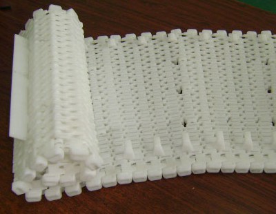 模塊化塑料網(wǎng)帶是由熱塑性材料與固體塑料棒成型模塊的構(gòu)建。除了狹窄的腰帶(一條)完整的模塊或更小的寬度),都是建立在模塊間的接縫錯開與相鄰的行在。這結(jié)構(gòu)可以提高橫向強度,便于維護。